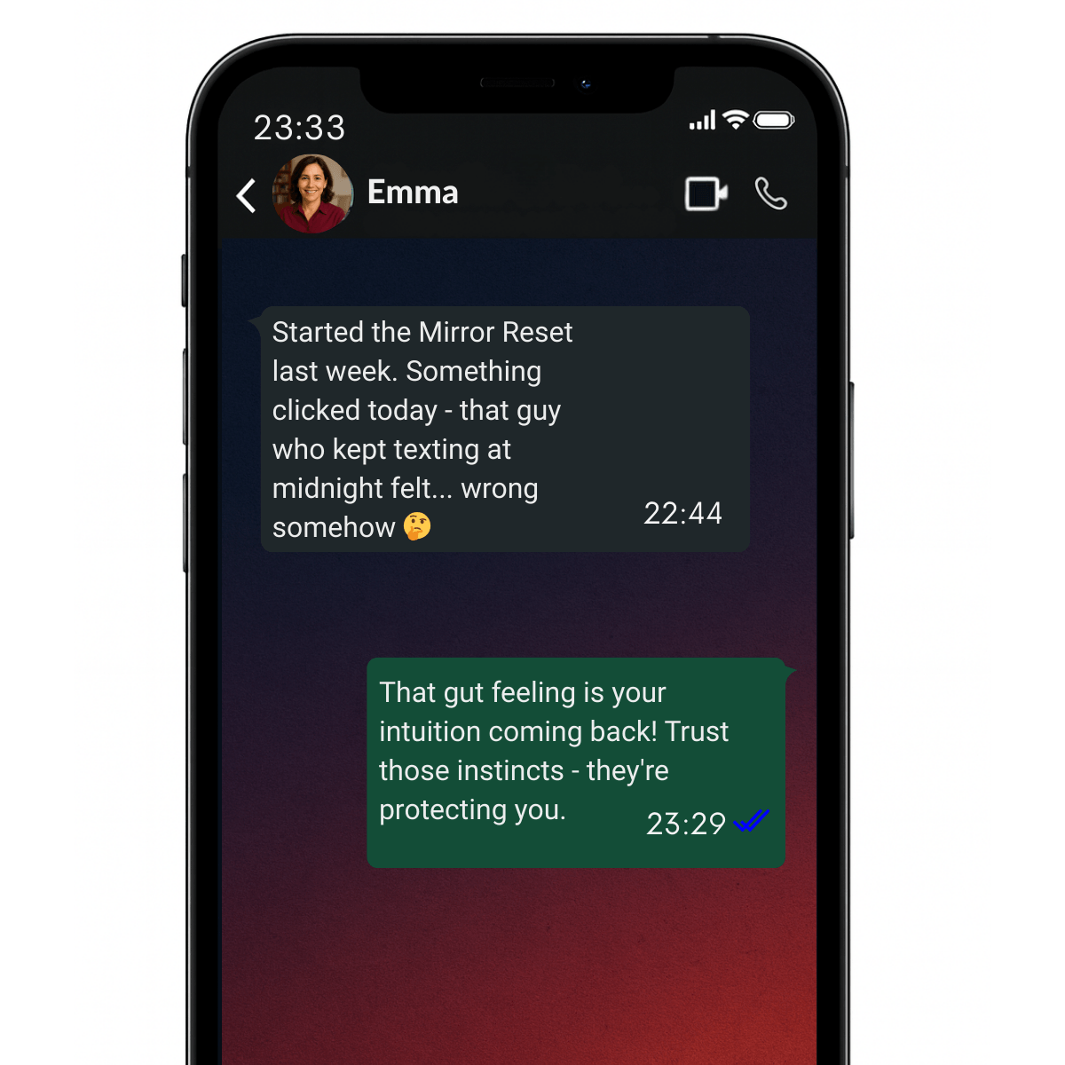Instead of forcing you to "act confident" or endlessly analyze your past, Mirror Reset focuses on the present—it helps you understand and gradually change the attraction template that formed during past toxic relationships.